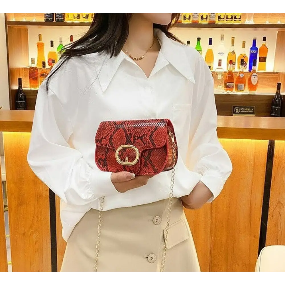 Be the talk of the town with this stylish Red Snakeskin Purse! This trendy accessory features a striking snake print design in red color popping out from any outfit, making it easy to match with a wide range of fashion styles.